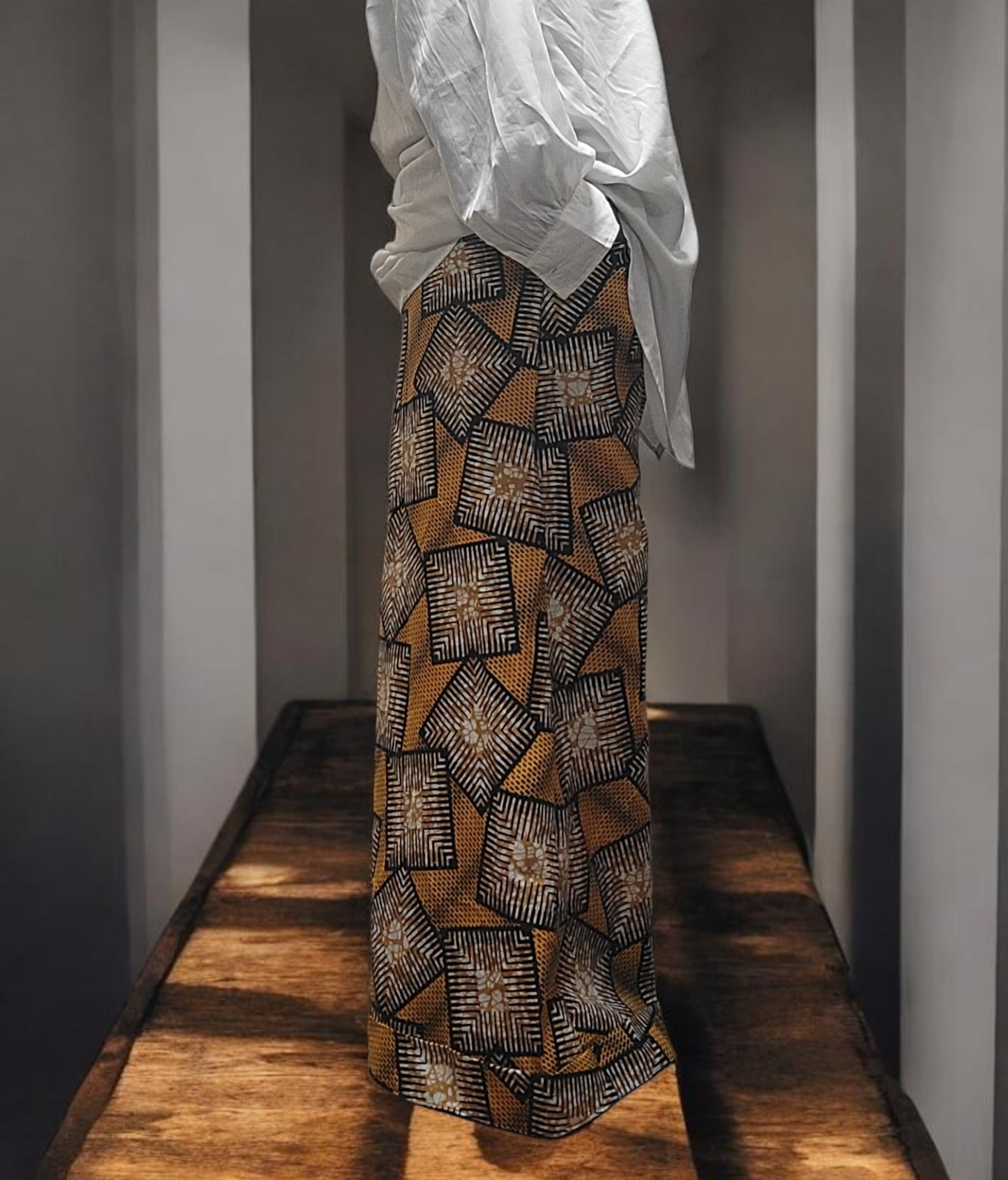 ❇️ アフリカン生地の特徴的な柄が、シンプルなトップスとも相性抜群!コーディネートの幅が広がります。